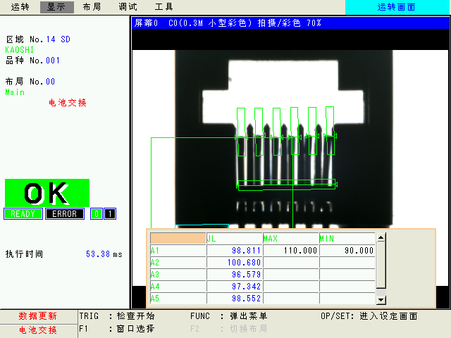 檢測銅芯位置是否正確,以及產(chǎn)品顏色,利用連接器功能,可以檢測銅芯頂端基于低端的距離,也可以檢測出銅芯間的距離。