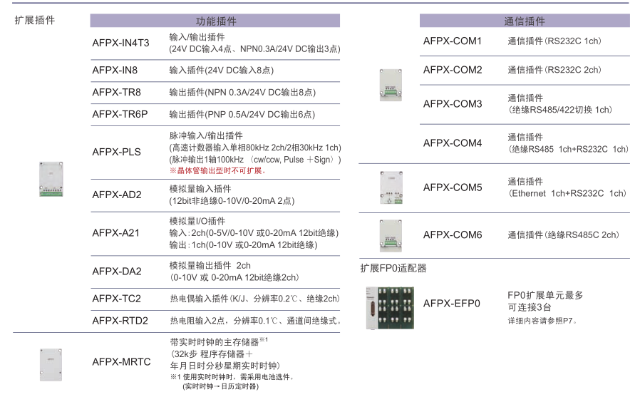 輸入/輸出、脈沖I/O、模擬I/O、通信(RS485、RS232C、Ethernet)、外部存儲器